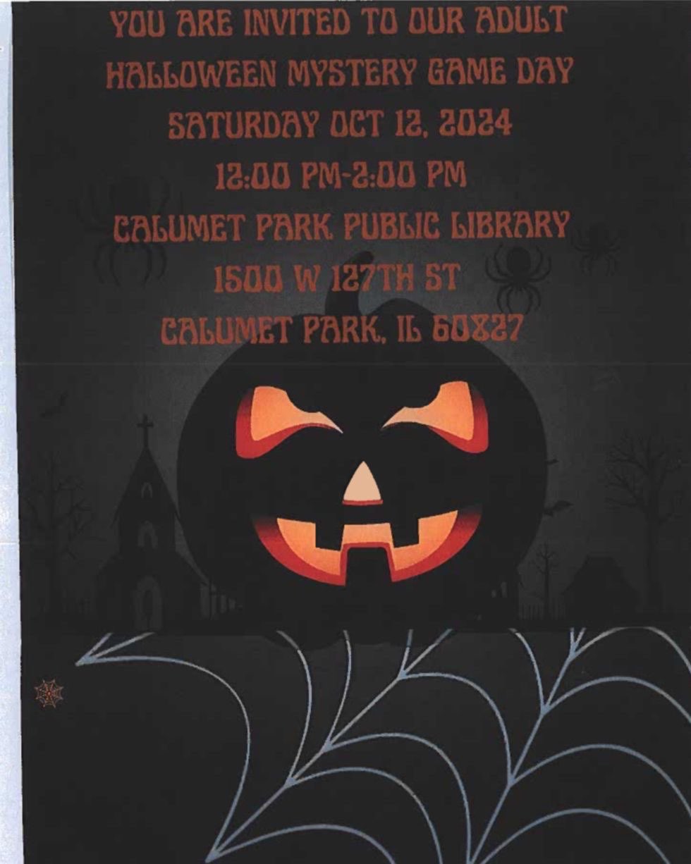 Adult Hallowen Mystery Game Day 12:00 pm – 2:00 pmOctober 12, 2024 Calumet Park Library1500 W 127th StCalumet Park , IL 60827708-385-5768View LocationMap Calumet Park Library iCal Google View full calendar