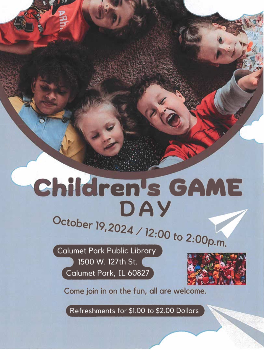 Childern's Game Day 12:00 pm – 2:00 pmOctober 19, 2024 Calumet Park Library1500 W 127th StCalumet Park , IL 60827708-385-5768View LocationMap Calumet Park Library iCal Google View full calendar