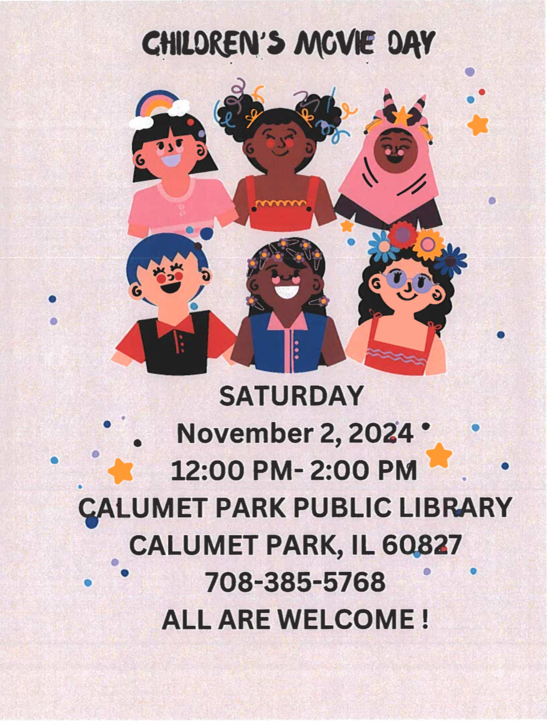 Childern's Movie Day 12:00 pm – 2:00 pmNovember 2, 2024 Calumet Park Library1500 W 127th StCalumet Park , IL 60827708-385-5768View LocationMap Calumet Park Library iCal Google View full calendar
