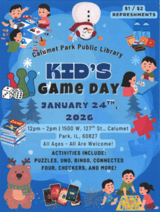Kids Game Day 12:00 pm – 2:00 pmJanuary 24, 2026 Calumet Park Library1500 W 127th StCalumet Park , IL 60827708-385-5768View LocationMap Calumet Park Library iCal Google View full calendar