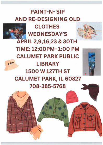 Paint-N-Sip & Re-Designing Old Clothes 12:00 pm – 1:00 pmApril 2, 2025 Calumet Park Library1500 W 127th StCalumet Park , IL 60827708-385-5768View LocationMap Calumet Park Library iCal Google View full calendar