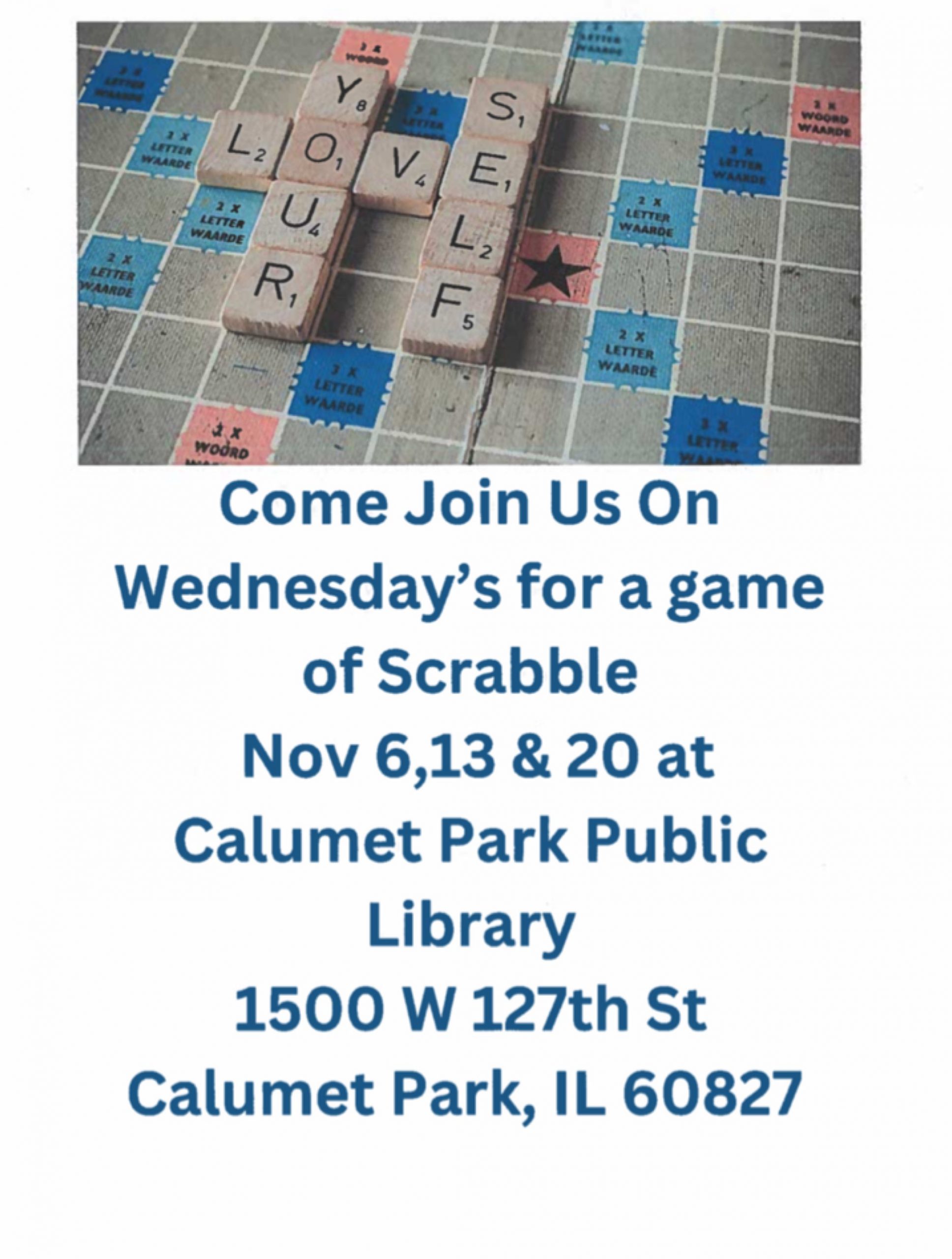 Scrabble game 12:00 pm – 2:00 pmNovember 6, 2024 Calumet Park Library1500 W 127th StCalumet Park , IL 60827708-385-5768View LocationMap Calumet Park Library iCal Google View full calendar
