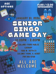 Senior Bingo Game Day 12:00 pm – 2:00 pmJanuary 31, 2026 Calumet Park Library1500 W 127th StCalumet Park , IL 60827708-385-5768View LocationMap Calumet Park Library iCal Google View full calendar