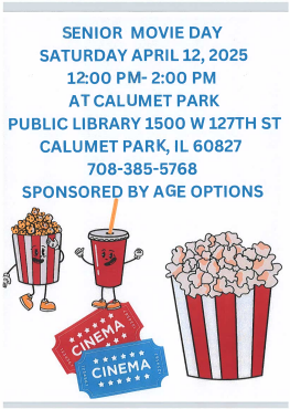Senior Movie Day 12:00 pm – 2:00 pmApril 12, 2025 Calumet Park Library1500 W 127th StCalumet Park , IL 60827708-385-5768View LocationMap Calumet Park Library iCal Google View full calendar Post navigation Paint-N-Sip & Re-Designing Old Clothes April 9, 2025Paint-N-Sip & Re-Designing Old Clothes April 16, 2025