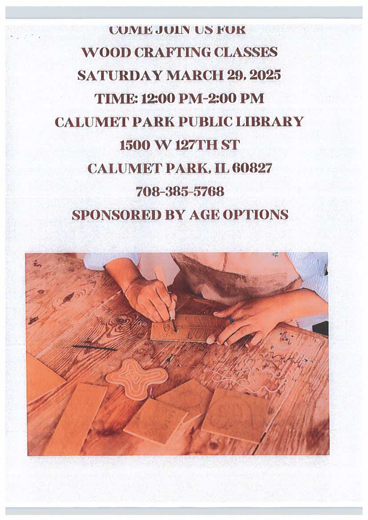 Wood Crafting Classes 12:00 pm – 2:00 pmMarch 29, 2025 iCal Google View full calendar Post navigation Sip N Paint March 26, 2025Paint-N-Sip & Re-Designing Old Clothes April 2, 2025